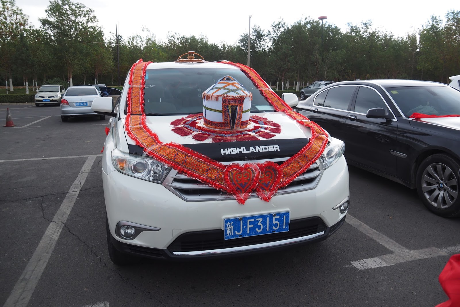 The wedding car with a yurt in front